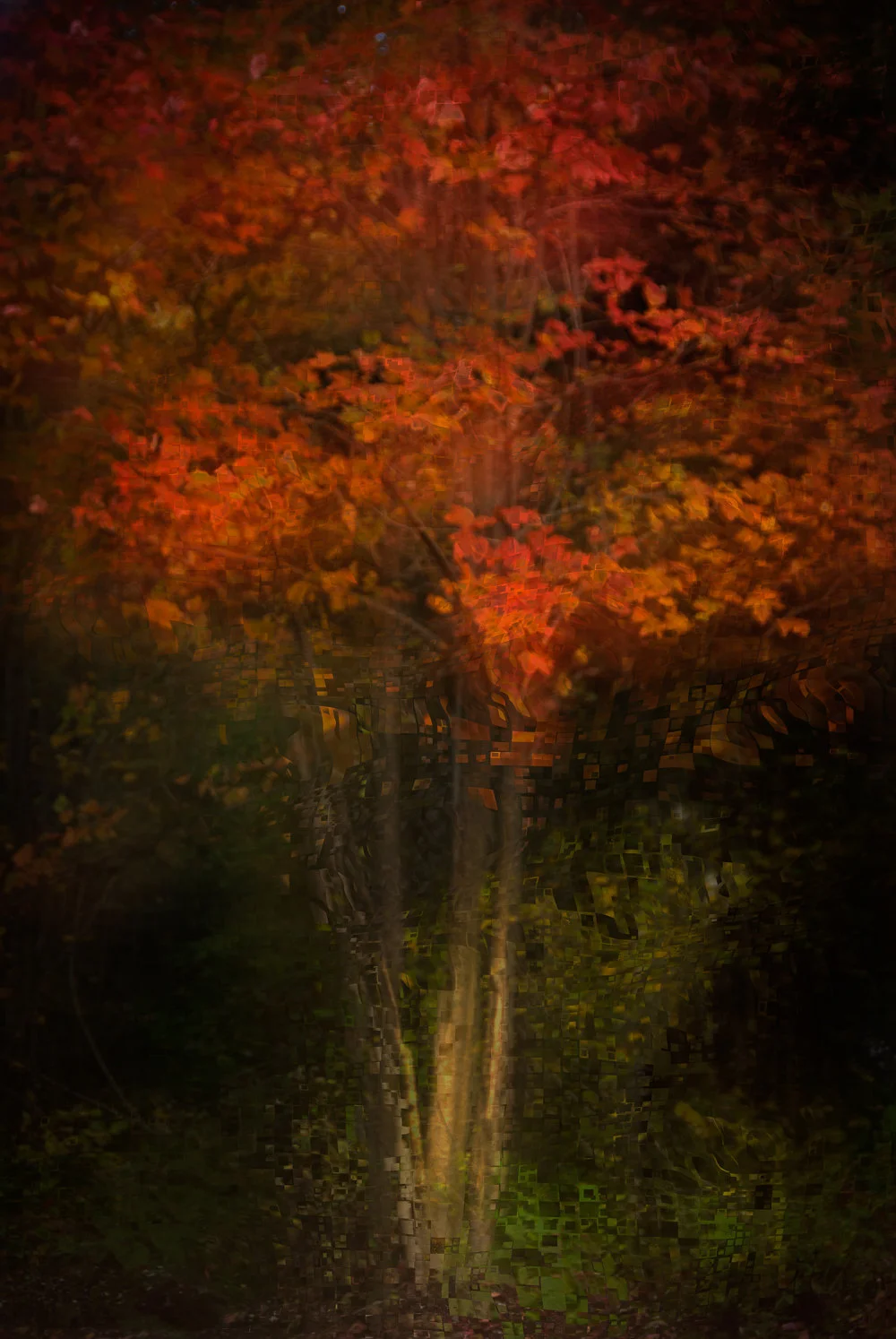 Between Worlds is an impressionist styled photograph of a fall tree enhanced with digital effects.