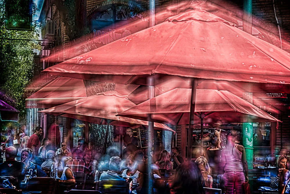 Merry Afternoon is a photograph in the impressionist style of a patio scene on a sunny day.
