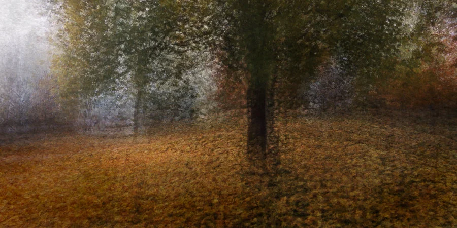 October's song is an impressionist styled photograph featuring a October scene in a stunning combination of gold, orange, blue and green.